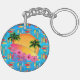 Surfer girl with surf board, palm trees, sunset, and hibiscus flowers.