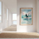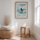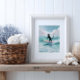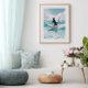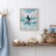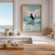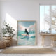 Catch the fun of the waves with this whimsical watercolor artwork featuring a black cat surfing on a sunny beach. Soft pastel tones of blue, pink, and sandy beige bring a playful, lighthearted coastal vibe to your space.
