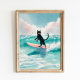 Surfer Whimsical Black Cat Watercolor Art Poster