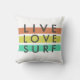 White decorative throw pillow with sunset colored stripes in peach, mint green and yellow printed with the message "live, love, surf". For surfer girls! Background color of this design can be changed to color of your choice. To change, use the customize it button and choose your color.