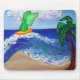 (The painting is of a green angel on an orange surfboard catching a wave. A sun glows in the background and palm tree gently sways on the beach. The wave is getting ready to crash on the beach smoothing the sandy surface. The green angel pays tribute to the Archangel Raphael whose color is green and is known for bringing healing. The sun helps sustain life and through it plants such as palm trees strengthen and grow. The power of sun's energy is symbolized in the matched orange- yellow surfboard. The beach is clean and smooth. This painting was inspired by the "Wipe Out Cancer Angel". Instead of adding text of this painting, it was left open so you can your own wipe out, riding the wave, or other go with flow message to the beach, cloud, or sky.