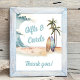 Cute surfing-themed baby shower gift drop off sign featuring a watercolor tropical beach scene with breaking waves, palm trees, sandy shores, and vibrant teal and brown surfboards, and a fun blue retro script.