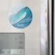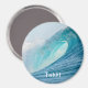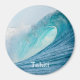 Round magnet with a great surfing barrel wave breaking into a big splash and turquoise colors in the best place to surf, the Pacific Ocean with the text: 'Tahiti'.