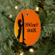 Surfer girl personalized Christmas tree ornament. The image is a girl standing with a surfboard against a bright orange background. Customize black text with her name and year. Add her photo to the back.