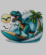 A playful illustration of a T-Rex riding a surfboard on a giant wave, with a palm tree and seagulls in the background.