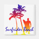 This classic surf icon features a longboard surfer looking out at the ways from under palm trees at Surfrider Beach. This design is a blend of vibrant colors. These designs come in several colorways.