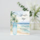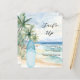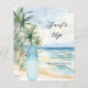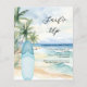 An invitation for a summer beach party. A watercolored sandy beach, ocean waves and palm trees as background, and a blue surfboard on the beach.