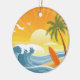 Round design of a beach scene with a small island sporting a palm tree and surf board rising from the sand, surrounded by blue waves under the setting sun.