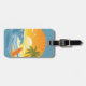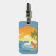 Round design of a beach scene with a small island sporting a palm tree and surf board rising from the sand, surrounded by blue waves under the setting sun. This luggage tag is fully customizable and ready to be personalized.