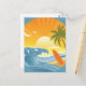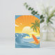 Round design of a beach scene with a small island sporting a palm tree and surf board rising from the sand, surrounded by blue waves under the setting sun. This postcard is fully customizable.