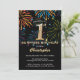 Surprise 1st Birthday Black Gold Rainbow Firework Invitation