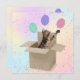 Bengal cat in cardboard box with balloons and confetti for Surprise Birthday Party invite