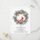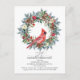 A beautiful red cardinal is framed by an elegant winter wreath. it is decorated with red flowers and berries along with pinecones. This timeless watercolor design features trendy calligraphy to give it a modern vibe. It's the perfect way to invite friends and family to a special occasion.