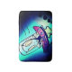 A surreal alien with an elongated head rides a glowing UFO, surrounded by deep blue gradients and neon purple highlights. The playful hand-drawn style and luminous color contrast create a whimsical, otherworldly scene that blends imagination with vibrant visual energy.