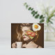 A woman holds a coffee mug and a breakfast of avocado and tomato toast and a fried egg float in the air surreal art