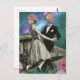 A surreal art style dancing couple with flowers for their heads dance beside a vintage train