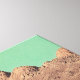 A small house stands in a desert landscape with jagged mountains in the background. Beneath the surface, a vibrant underwater scene features colorful coral and fish.