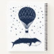 This dreamy notebook design features a whimsical dark blue hot air balloon floating above a majestic whale, surrounded by scattered stars. The scene evokes wonder, imagination, and curiosity—perfect for students, writers, or anyone inspired by the skies and seas. Personalized with a name, it’s a unique choice for journaling, note-taking, or creative thinking.