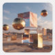 This surreal artwork presents a refined vision of balance and suspended reality, where polished spheres and sculptural cubes hover effortlessly above a quiet desert landscape. Warm golden reflections shimmer across mirror-like surfaces, capturing fragments of sky, sand, and distant mountains. Translucent and marble-textured cubes intersect light in subtle ways, creating depth, contrast, and a sense of architectural elegance.