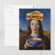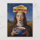 A surreal surprised woman with a grilled cheese with bacon sandwich on her head and a steaming hot bowl of soup in her hands