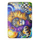A surreal lion with a radiant multicolored mane charges forward, surrounded by vivid celestial elements like a glowing sun, crescent moon, and swirling clouds. The bold patterns and electric colors create a striking fusion of motion, fantasy, and cosmic energy.