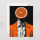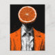 A surreal person with an orange for a head wearing an orange suit