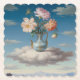 This coaster features a vase like an Aladdin's lamp. The surrealist painting shows an antique blue porcelain vase with four pink or peach flowers on a fluffy white cloud. The vase is adorned with intricate gold filigree patterns and features a gently curved spout, while the flowers within boast hues of soft pink, peach and peachy orange with dew-kissed petals. Below the floating scene, a distant mountain range fades into a clear blue sky with white clouds. Diffused lighting creates a dreamy ethereal atmosphere throughout the painting. The coaster is a scalloped square paper pulp coaster. There are six coasters in the coaster set.