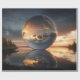 This surreal artwork captures a breathtaking moment where the sky, earth, and water fold into a single, luminous reflection. A colossal mirror-like sphere rests gently above a calm lake, encapsulating a dramatic sunset filled with glowing clouds, fading light, and deep atmospheric tones. The sphere reflects the entire horizon—sky above and water below—creating a mesmerizing illusion of a world contained within itself.