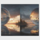 Warm golden light spills across the scene, contrasting beautifully with cooler blues and shadowed clouds, while the stillness of the water amplifies the sense of calm and symmetry. Trees along the shoreline frame the composition subtly, grounding the cosmic elegance of the sphere in a peaceful natural setting. The result feels timeless, meditative, and quietly powerful.