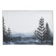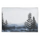 Misty forest and hills with fir trees in foreground.
