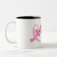 This coffee mug is shown in a breast cancer pink power pink ribbon print.