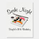 Sushi Dinner Party Signs. This sign is designed with a white background and a plate of sushi with, a cup of soy sauce and chopsticks. This minimalist design can be used for birthdays, proms, bridal showers, housewarming parties, or any other party you would like. Additional party supplies are available at Metro-Events Zazzle shop and Metro-Event.com.