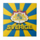 The national coat of arms of Sverige (Sweden), plus the country name, are placed in a perspective design on a starburst background, which displays the national flag colors.