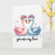 This greeting card shows two elegant swans facing each other on a white background, one blush pink on the left and the other sky blue on the right. Their curved necks meet to form a heart shape, and their closed eyes and gentle tilt toward one another suggest a quiet, romantic closeness 🥰. Each swan wears a small flower crown with bright pink blossoms, green leaves, and a few tiny berry accents, adding a sweet, celebratory touch ❤️. A light wash of translucent blue water sits beneath them, with soft ripples that keep the scene calm and airy. Around the swans, scattered pink and blue dots drift across the space alongside small star-like shapes, giving the layout a light, floating feel. The phrase “you are my love” appears below the illustration in flowing cursive-style lettering, set in a medium blue that matches the water tones. The swans’ wings are shaded like watercolor, with pale gradients that fade softly into the white background. Tiny pink and blue speckles and a few delicate star marks are sprinkled around the couple, mostly to the sides and above their heads.