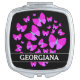 This compact mirror design features a swarm of artistic butterfly representations. The wings of the butterflies feature a line pattern colored various shades of colors like magenta and purple, while the body is colored shades of aquamarine. It also features a customized name.