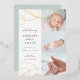 Elegant birth announcement features three newborn photos aligned vertically. Personalize with your baby's name, birth date, stats, and a family signature, accented with graceful gold foil swashes at the top and bottom.