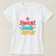 Picture a t-shirt that speaks volumes with its design—"Sweat, Smile, Repeat." The words are stylized in a bold, vibrant font, cascading down the shirt in a striking gradient of colors, capturing the energy of a great workout. Surrounding the text are playful icons of sweat droplets, a beaming smiley, and looping arrows, visually echoing the mantra. The background is a sleek, neutral shade, making the message pop. This t-shirt is more than just apparel; it's a statement of positivity and perseverance!