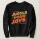 "Juggle Your Joys." is the text on this t-shirt design, printed in a rainbow of colors and arranged in a dynamic, overlapping composition.