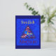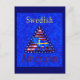 A graphic depiction of a Moose in the colors of the Swedish flag against the triangular shape of the Swedish "watch for Moose crossing" traffic road sign, in the colors of the American flag