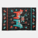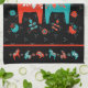 This kitchen towel has a Swedish folk dala horse design with matching folk art flowers in Sweden's flag colors of teal and red on black background. At the top and bottom are a row of matching smaller dala animals and flowers. You can make the background pattern on this kitchen towel smaller or larger.