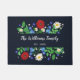 Dark blue welcome mat with with Swedish folk flowers: poppies, oxeye daisies, violets, forget-me-nots, and elm leaves.