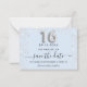 A girly and trendy Save the Date card for a Sweet 16, 16th birthday party. A baby blue background decorated with faux glitter dust. Personalize and add a date and name/age. The text: Save the Date is written with a large trendy hand lettered style script. Number 16 with a balloon style font.