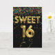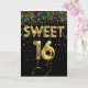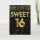 Gold sweet 16 balloons and colorful confetti on black background for Sweet 16 birthday.