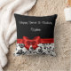 Custom happy birthday monogram throw pillows with beautiful red colored bow and floral damask pattern on the cover with monogram space for your birthday girl. Designed as a birthday pillow for family or friends.
