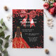 A modern, stylish and glamorous invitation for a Sweet 16, 16th birthday party. A black background with sparkles, a red dress and a red bow. The name is written with a modern hand lettered style script. Personalize and add your party details.