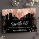A black background decorated with blush, rose gold faux glitter drips, sparkles, and balloons. Personalize and add a date and name/age. The text: Save the Date is written with a large trendy hand lettered style script.