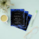 A girly and trendy Sweet 16, 16th birthday party invitation. On front: A chic black background. Decorated with royal blue faux glitter dust. Personalize and add a name and party details. The name is written with a hand lettered style script.