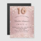 An elegant invitation magnet for Sweet 16, 16th birthday party. A blush pink gradient background. Decorated with rose gold faux glitter dust. Personalize and add a name and party details. The name is written with a hand lettered style script. Number 16 is written with a balloon style font.
