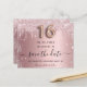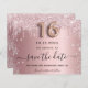 A girly and trendy Save the Date card for a Sweet 16, 16th birthday party. Blush pink background decorated with pink and faux silver glitter drips and dust. Personalize and add a date and name/text. The text: Save the Date is written with a large trendy hand lettered style script with swashes. Number 16 with a balloon style font.