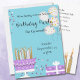 Sweet Sixteen birthday party invitation with cute retro style pedestal cake, 16 candles, sparkly confetti and balloon details in lavender, black and gold colors on aqua blue background. Coordinating candle accents on the back. Edit all your details on both front and back in the easy "personalize it" text editor.
